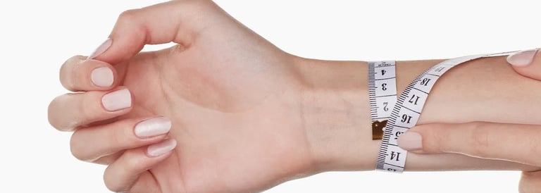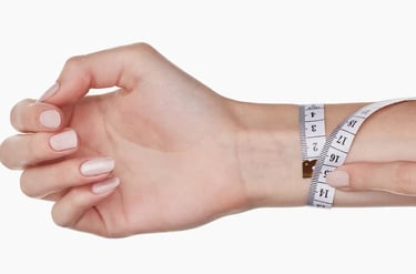 Con la palma abierta y mirando hacia arriba, enrolla la cinta métrica alrededor de tu muñeca. Anota la medida de tu muñeca.